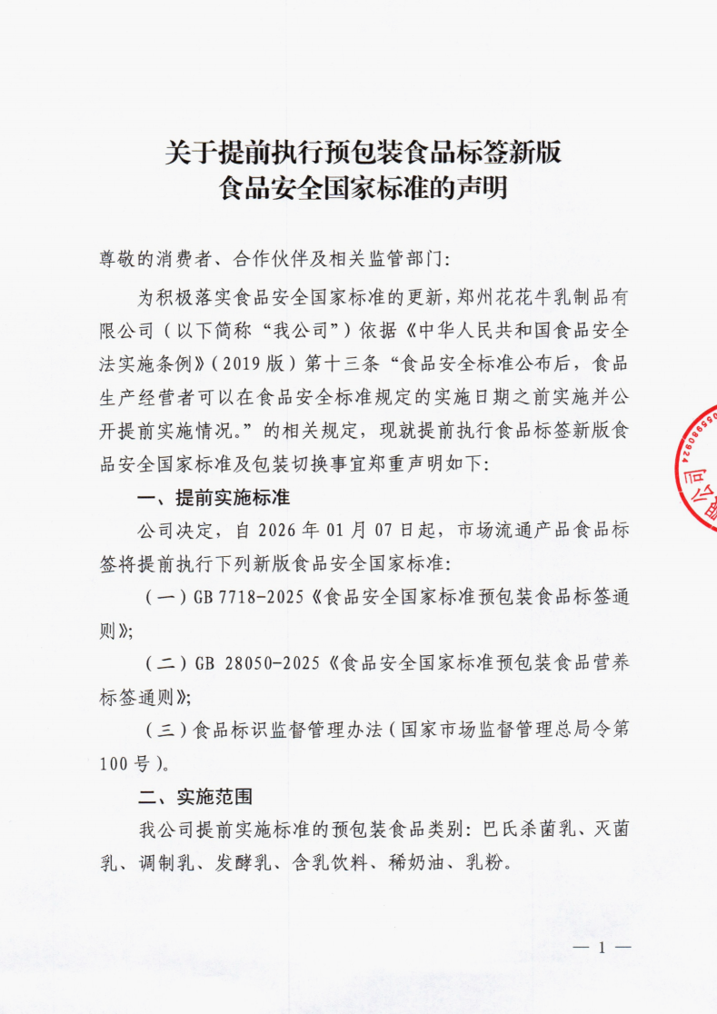 關(guān)于提前執(zhí)行預包裝食品標簽新版食品安全國家標準的聲明
